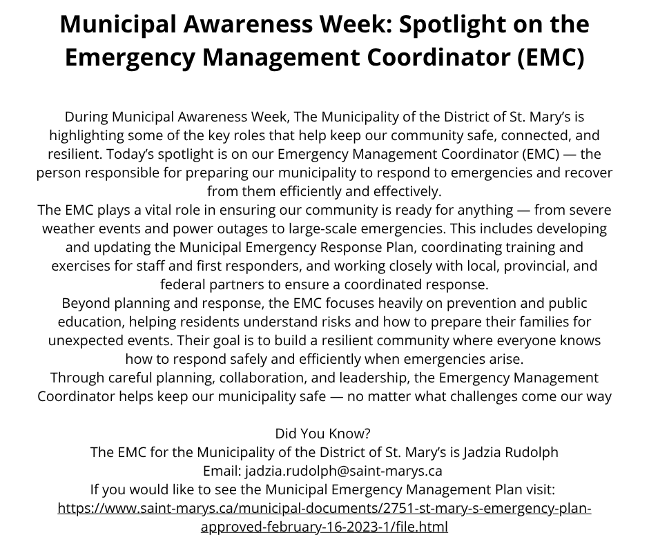 During Municipal Awareness Week, The Municipality of the District of St. Mary’s is highlighting some of the key roles that help keep our community safe, connected, and resilient. Today’s spotlight is on our Emergency Management Coordinator (EMC) — the person responsible for preparing our municipality to respond to emergencies and recover from them efficiently and effectively.