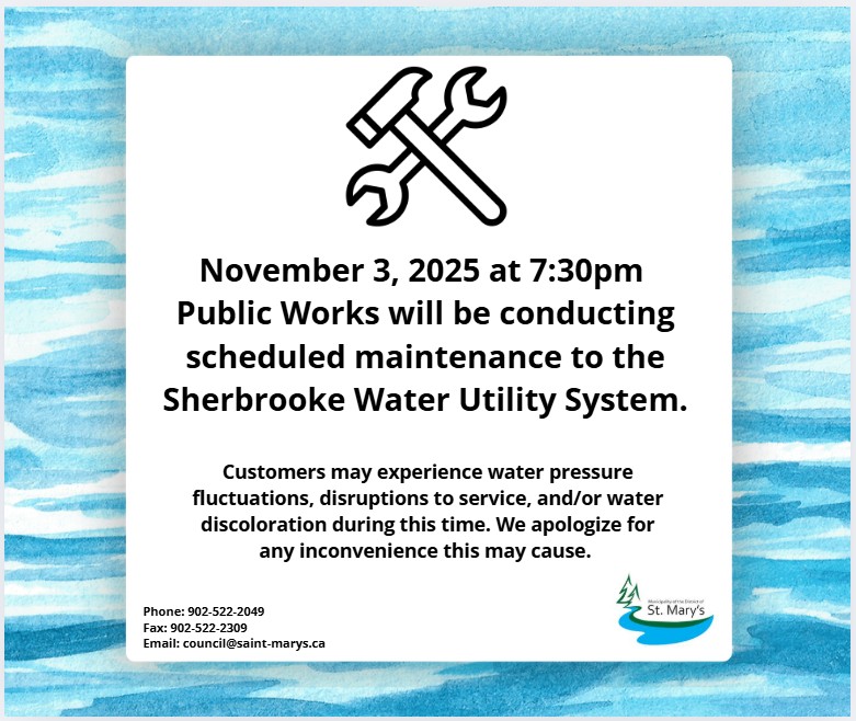 Public Works will be conducting scheduled maintenance to the Sherbrooke Water Utility System.