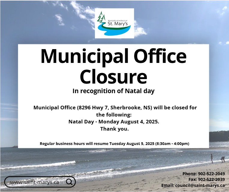 The Municipal Office (8296 Highway 7, Sherbrooke NS) will be closed August 4, 2025 in recognition of Natal Day.