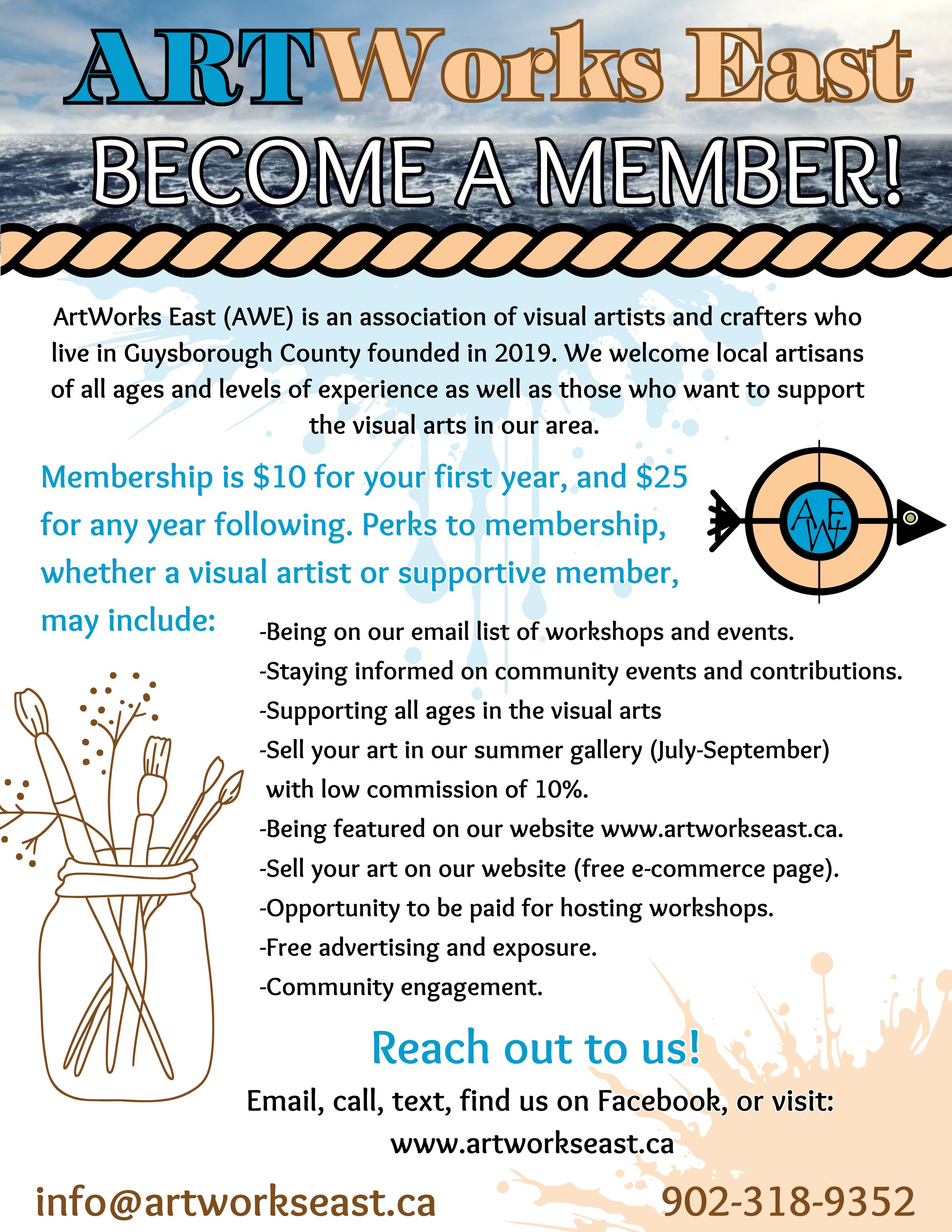 Become a Member! Artworks East (AWE) is an association of visual artists and crafters who live in Guysborough County founded in 2019.