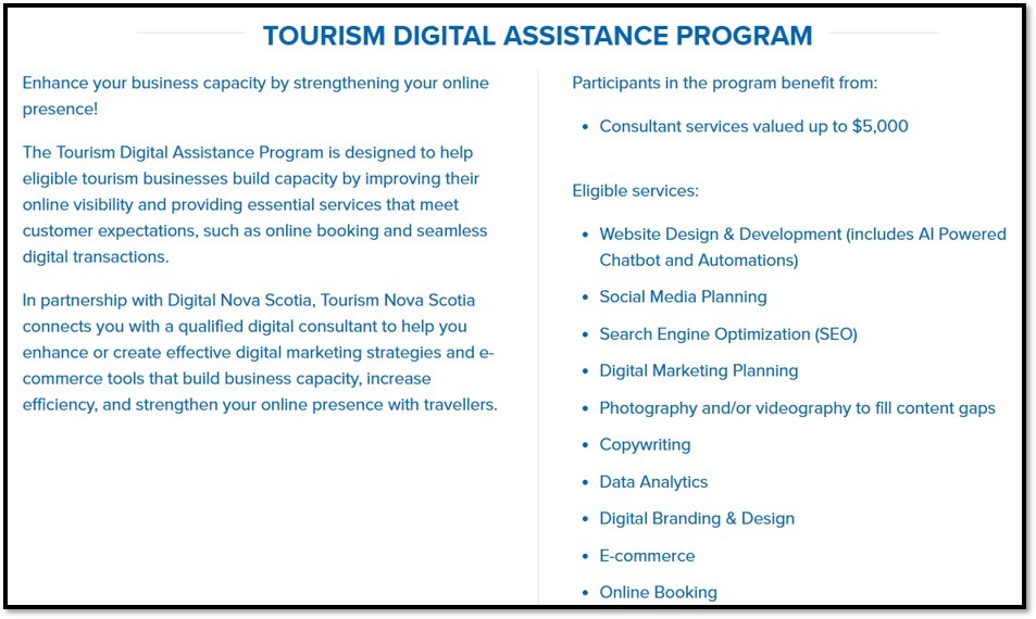 Applications for the 2025-26 Tourism Digital Assistance Program are open. The deadline to apply is Thursday, April 3, 2025. For more information click the link: Tourism Digital Assistance Program | Tourism Nova Scotia