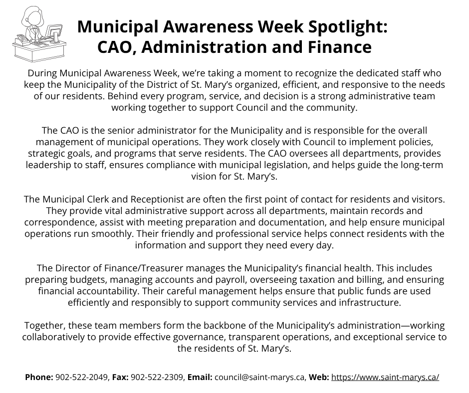 During Municipal Awareness Week, we’re taking a moment to recognize the dedicated staff who keep the Municipality of the District of St. Mary’s organized, efficient, and responsive to the needs of our residents. Behind every program, service, and decision is a strong administrative team working together to support Council and the community.