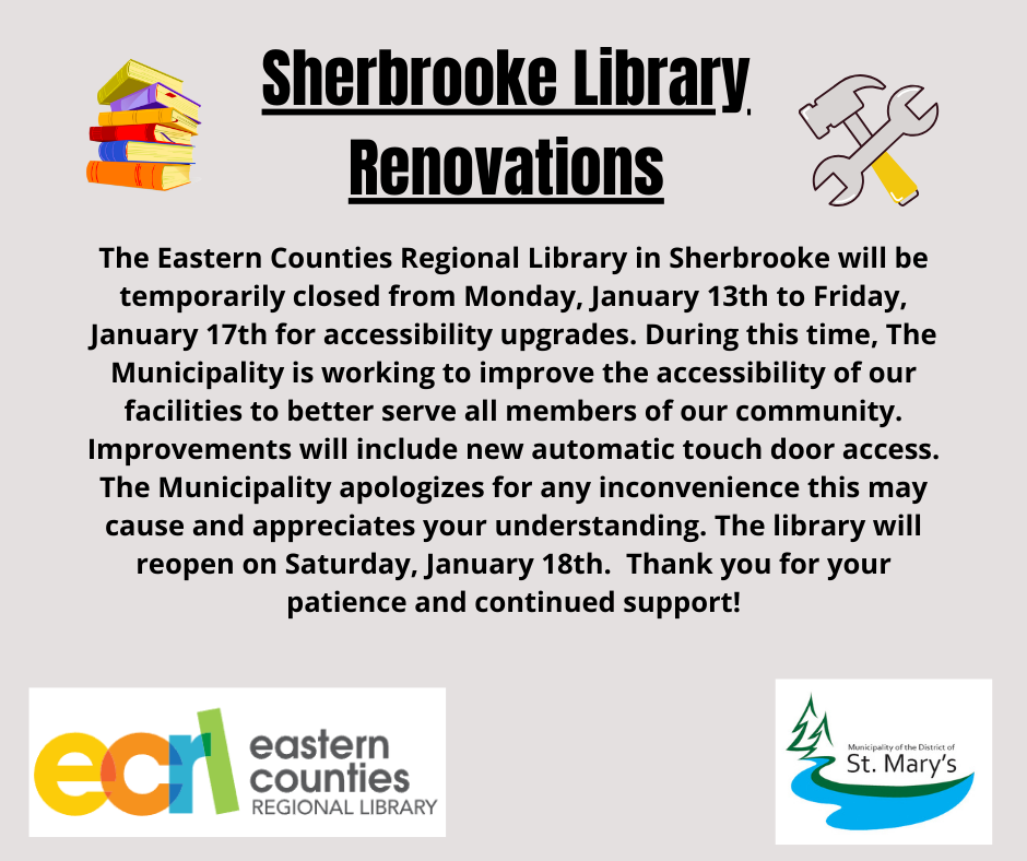 The Eastern Counties Regional Library in Sherbrooke will be temporarily closed from Monday, January 13th to Friday, January 17th for accessibility upgrades. During this time, The Municipality is working to improve the accessibility of our facilities to better serve all members of our community. Improvements will include new automatic touch door access. The Municipality apologizes for any inconvenience this may cause and appreciates your understanding. The library will reopen on Saturday, January 18th. Thank you for your patience and continued support!