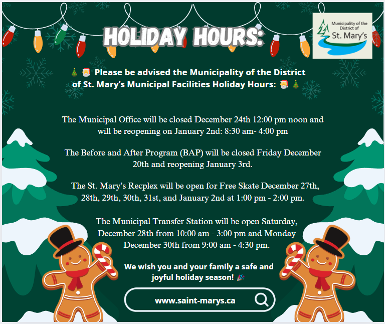 The Municipal Office wil be closed December 24th at 12:00 pm noon and will be reopening on January 2nd at 8:30 am - 4:00 pm.