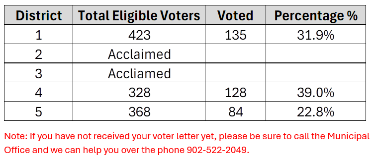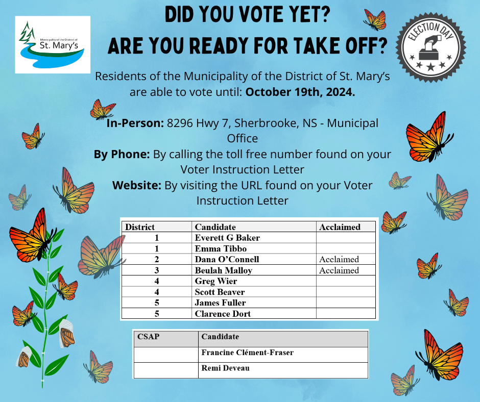 Residents of the Municipality of the District of St. Mary's are able to vote until October 19th, 2024 at 7:00 pm