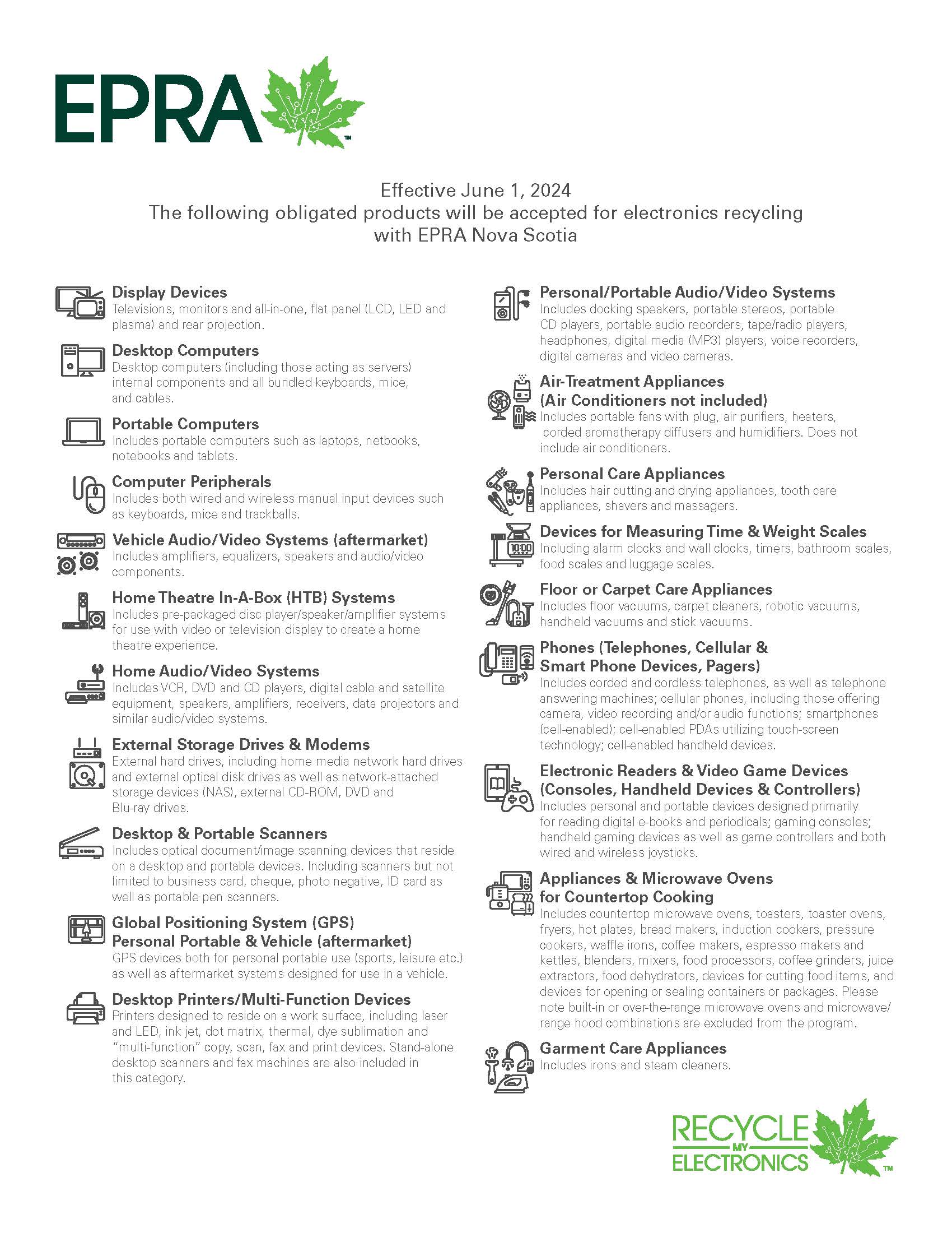 Electronic Products Recycling Association (EPRA): Effective June 1, 2024 The following obligated products will be accepted for electronics recycling with EPRA Nova Scotia