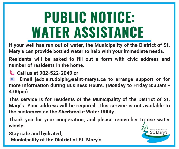 If your well has run out of water, the Municipality of the District of St. Mary’s can provide bottled water to help with your immediate needs.