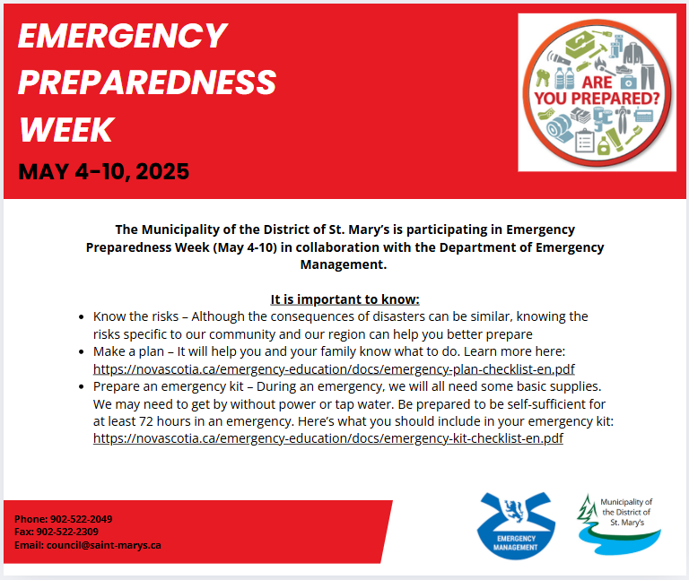 The Municipality of the District of St. Mary’s is participating in Emergency Preparedness Week (May 4-10) in collaboration with the Department of Emergency Management.
