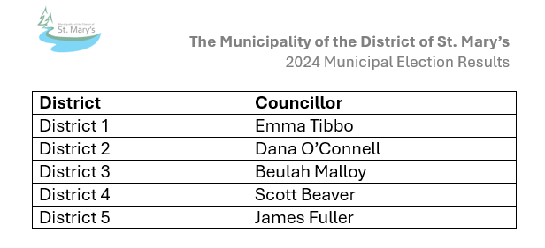 Sherbrooke, Nova Scotia – The Municipality of the District of St. Mary’s is excited to announce the formation of the new Municipal Council.