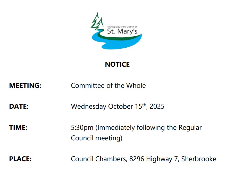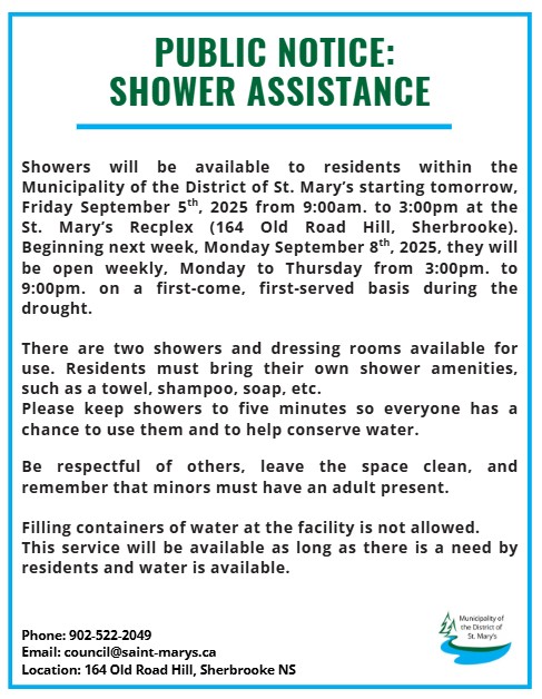 Showers will be available to residents within the Municipality of the District of St. Mary’s starting tomorrow, Friday September 5th, 2025 from 9:00am. to 3:00pm at the St. Mary’s Recplex (164 Old Road Hill, Sherbrooke). Beginning next week, Monday September 8th, 2025, they will be open weekly, Monday to Thursday from 3:00pm. to 9:00pm. on a first-come, first-served basis during the drought.