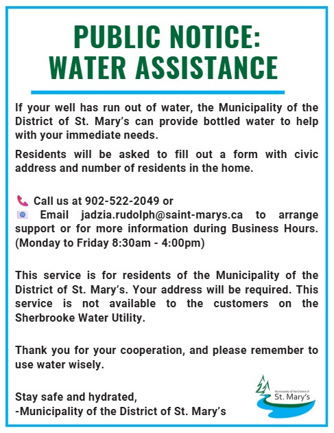 If your well has run out of water, the Municipality of the District of St. Mary’s can provide bottled water to help with your immediate needs.