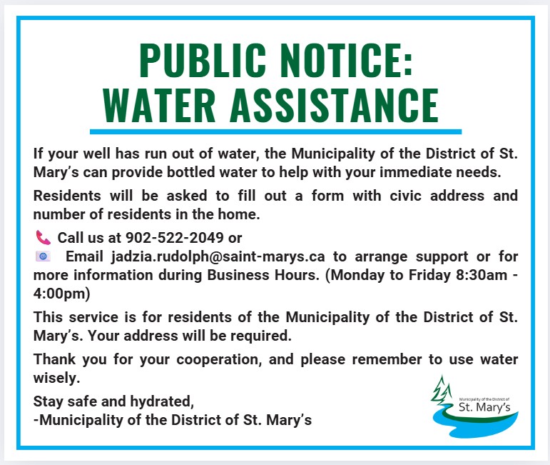 If your well has run out of water, the Municipality of the District of St. Mary’s can provide bottled water to help with your immediate needs.