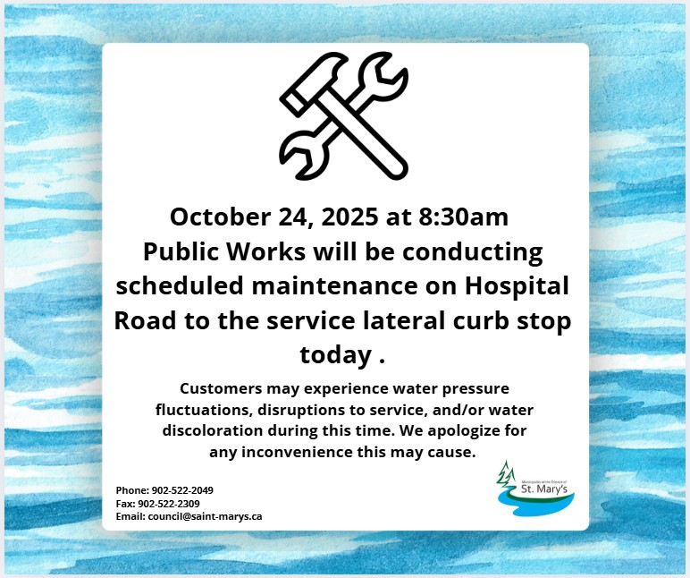 Please be advised that on October 24, 2025 beginning at 8:30am Public Works staff will be conducting scheduled maintenance and repairs to the water system on Hospital Road Extension