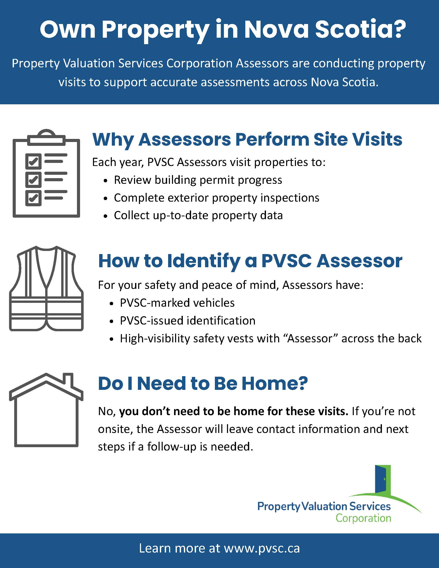 Property Valuation Services Corporation Assessors are especially busy this time of year, conducting exterior property inspections across Nova Scotia. They are reviewing building permit progress and gathering up-to-date information as part of the annual assessment process.