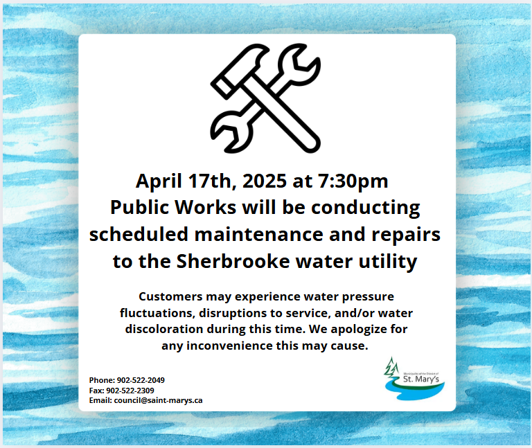 Please be advised that on April,17,2025 beginning at 7:30PM Public Works staff will be conducting scheduled maintenance and repairs to the water system.