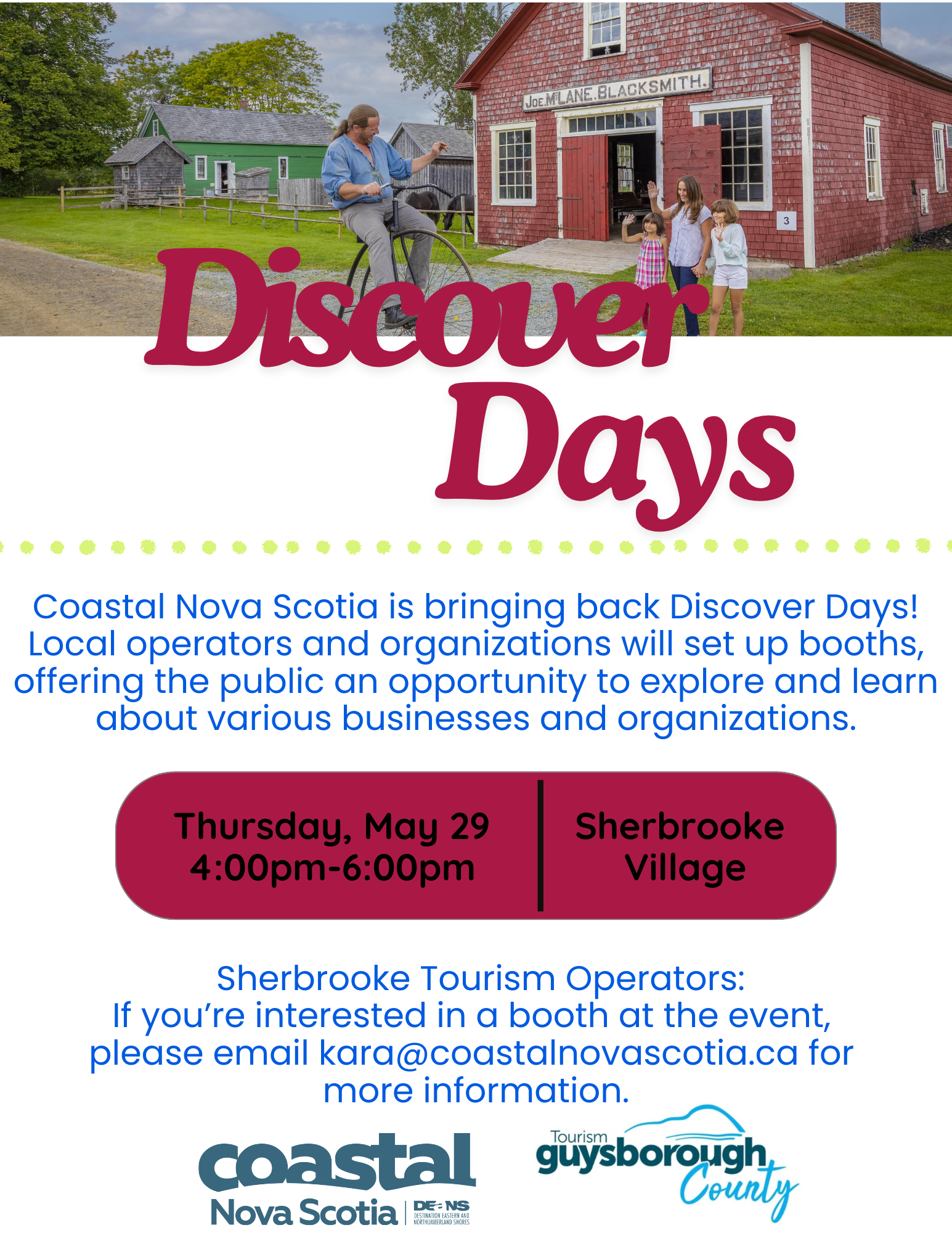 Coastal Nova Scotia is going to be hosting two Discover Days on the Eastern Shore - one at Sherbrooke Village (May 29 from 4:00pm-6:00pm) and one at the Chedabucto Lifestyle Complex (June 5 from 4:00pm-6:00pm). Local operators and organizations will set-up booths and the public will go around and learn about each business/organization. Each operator and/or organization that has a booth will need to provide a door prize - it can be baked goods, a gift certificate etc. If tourism operators are interested in a booth, they can email Kara at This email address is being protected from spambots. You need JavaScript enabled to view it..