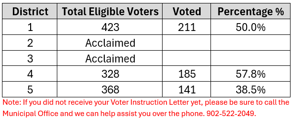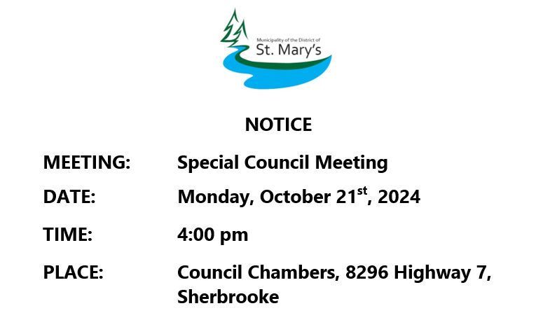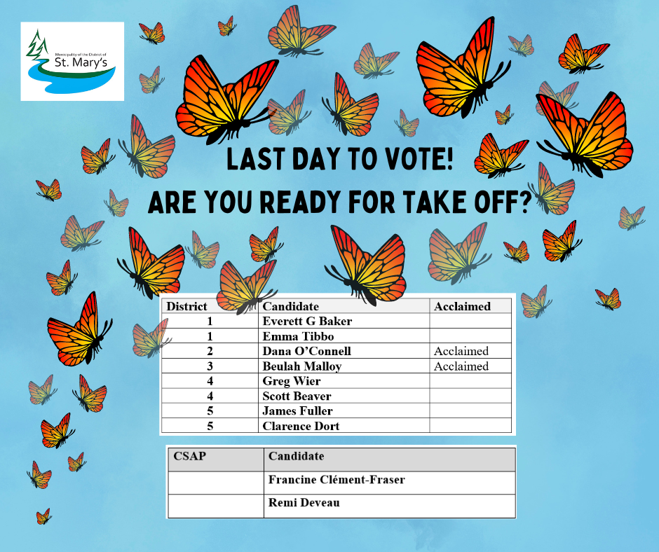 Residents of the Municipality of the District of St. Mary's are able to vote up until: October 19th, 2024 at 7:00 p.m.