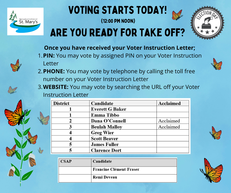 The 2024 Municipal Election and Conseil Scolaire Acadien Provincial Election start today at 12:00 noon.