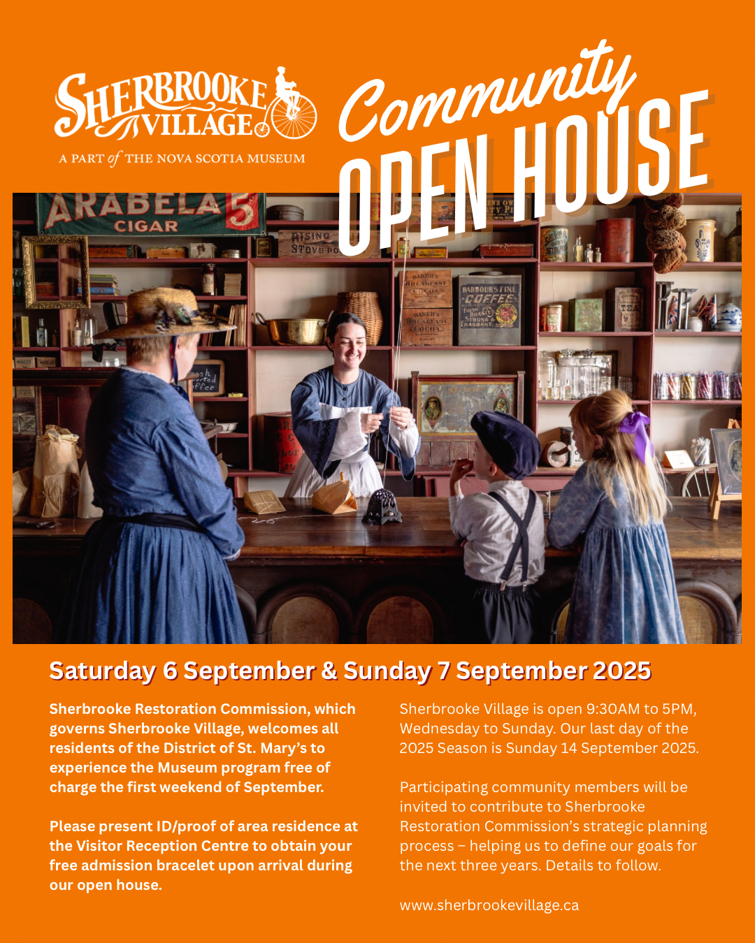 The Sherbrooke restoration Commission, which governs Sherbrooke Village wecomes all residents of the District of St. Mary's to experience the museum program, free of charge for the first weekend of September. Please present ID/Proof of residence at the Visitor Reception Centre to obtain your free admission bracelet upon arrival during our open house.