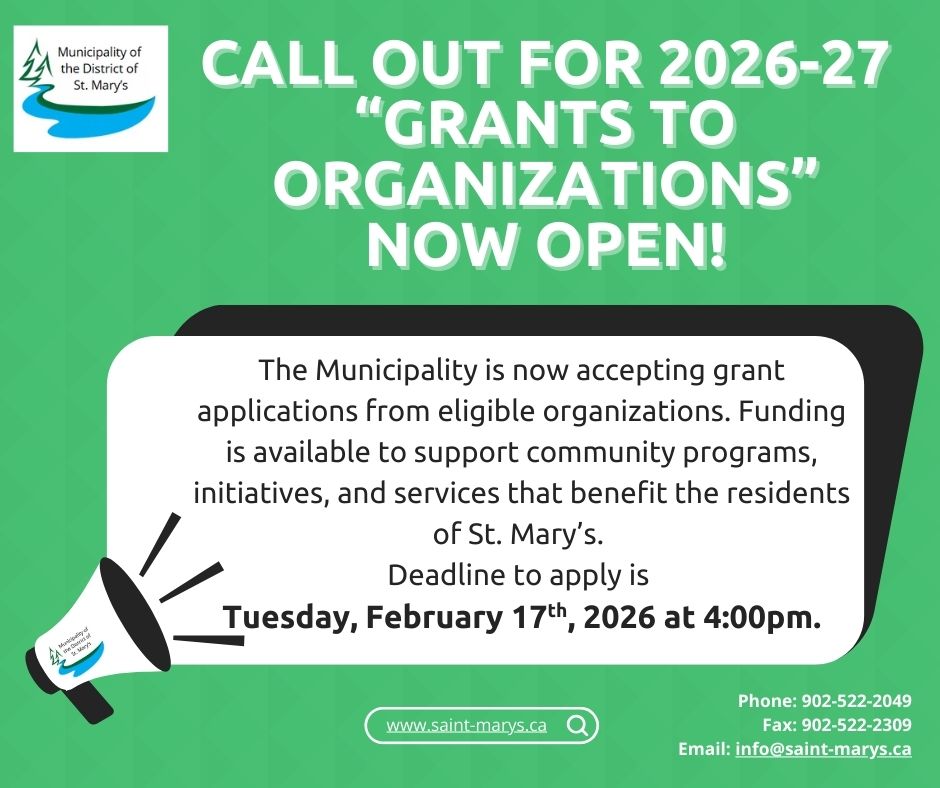 The Municipality is now accepting grant applications from eligible organizations. Funding is available to support community programs, initiatives, and services that benefit the residents of St. Mary’s.
