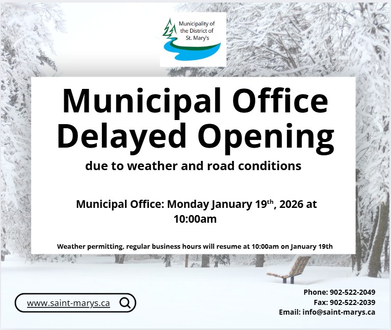 The Municipal Office will delay opening until 10:00am on Monday, January 19th, 2026 due to weather and road conditions.