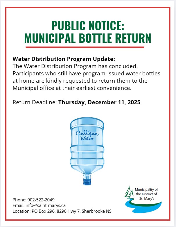 The Water Distribution Program has concluded. Participants who still have program-issued water bottles at home are kindly requested to return them to the Municipal office at their earliest convenience.