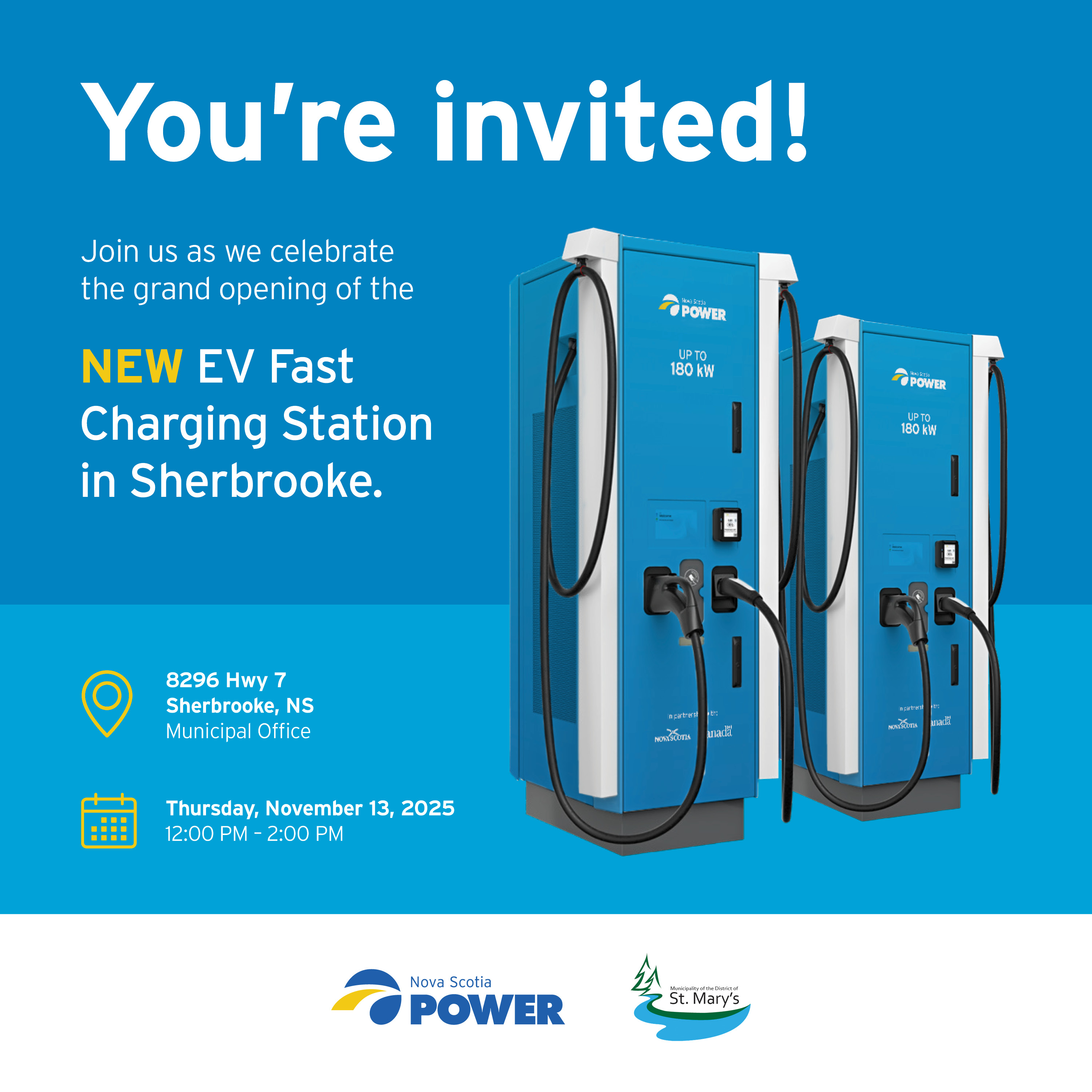 The Municipality of the District of St. Mary's along with Nova Scotia Power has teamed up to install 2 fast charging EV Chargers at the Municipal Office. (8296 Hwy 7, Sherbrooke NS)