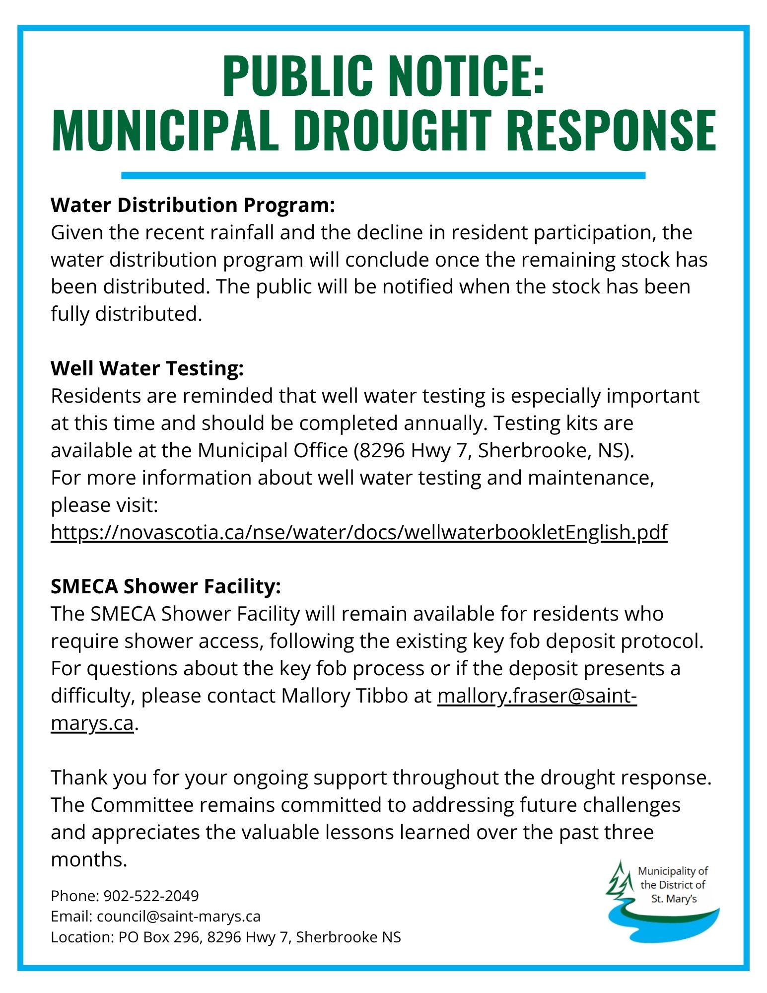 Residents are reminded that well water testing is especially important at this time and should be completed annually. Testing kits are available at the Municipal Office (8296 Hwy 7, Sherbrooke, NS).