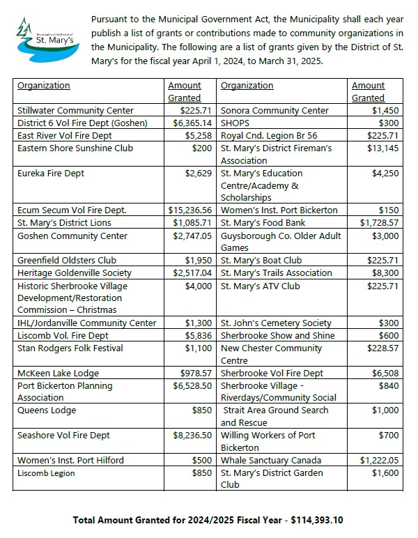 The Municpality provides grants to organizations annually through an application process to Council with a focus on capital projects. Organizations must be active with the Registry of Joint Stocks and must be located within the Municipality or serve/benefit residents within the Municipality.